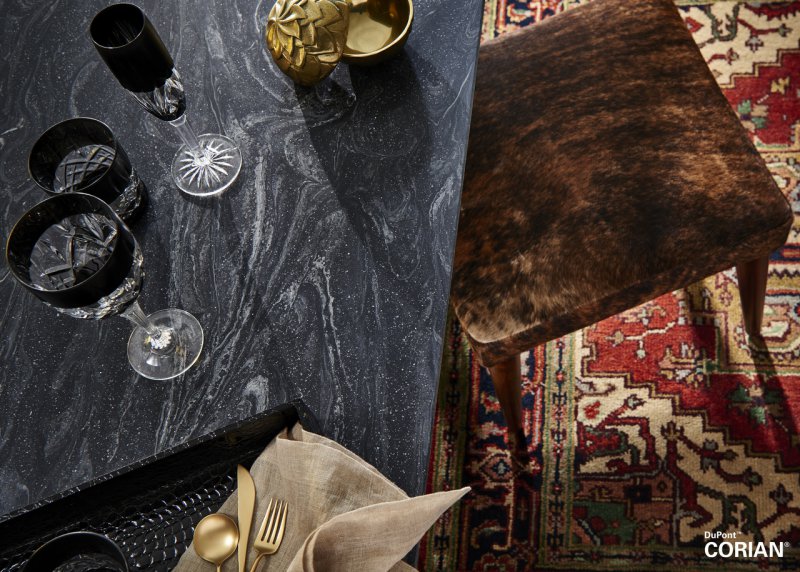 Corian® Solid Surface Cosmos Prima, one of the new Prima aesthetic colors introduced in 2017, is a color that is as bold as the universe, the rich black background is alight with streams and particles of gray and white that hint at the cosmos.